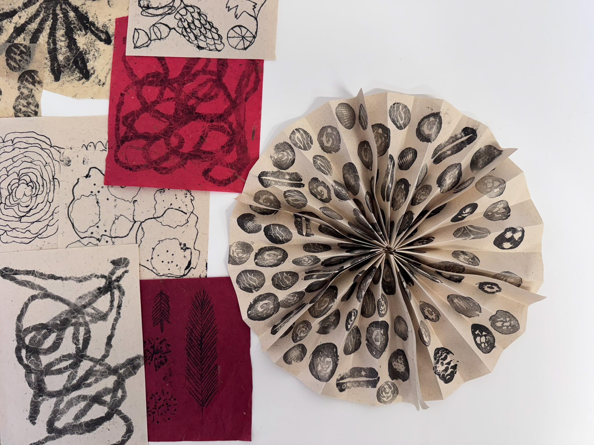 As part of the drawing activity earlier in the month I really enjoyed looking at the textures of natural forms I had gathered and this feels like a nice extension of that idea. The process of making stamps is a relaxing activity and can be simply be enjoyed just to slow down and play, making a page of graphic marks is lovely in itself or these can be turned into other pieces of art and decorations. I will show you a few examples and different outcomes I have been making in this post.